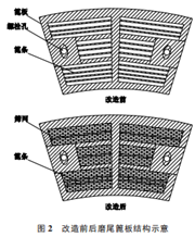 上述解決出料篦板堵塞的措施只能起到緩解出料篦板的堵塞、延長(zhǎng)出料篦板的清理周期的作用,不能從根本上徹底解決問(wèn)題。因此,還需對(duì)球磨機(jī)出料篦板的結(jié)構(gòu)進(jìn)行改造。通過(guò)利用現(xiàn)有材料自制防堵塞篦板,降低堵塞影響,增大磨尾通風(fēng)面積,解決飽磨問(wèn)題。改造前后磨尾篦板結(jié)構(gòu)示意見(jiàn)圖2。